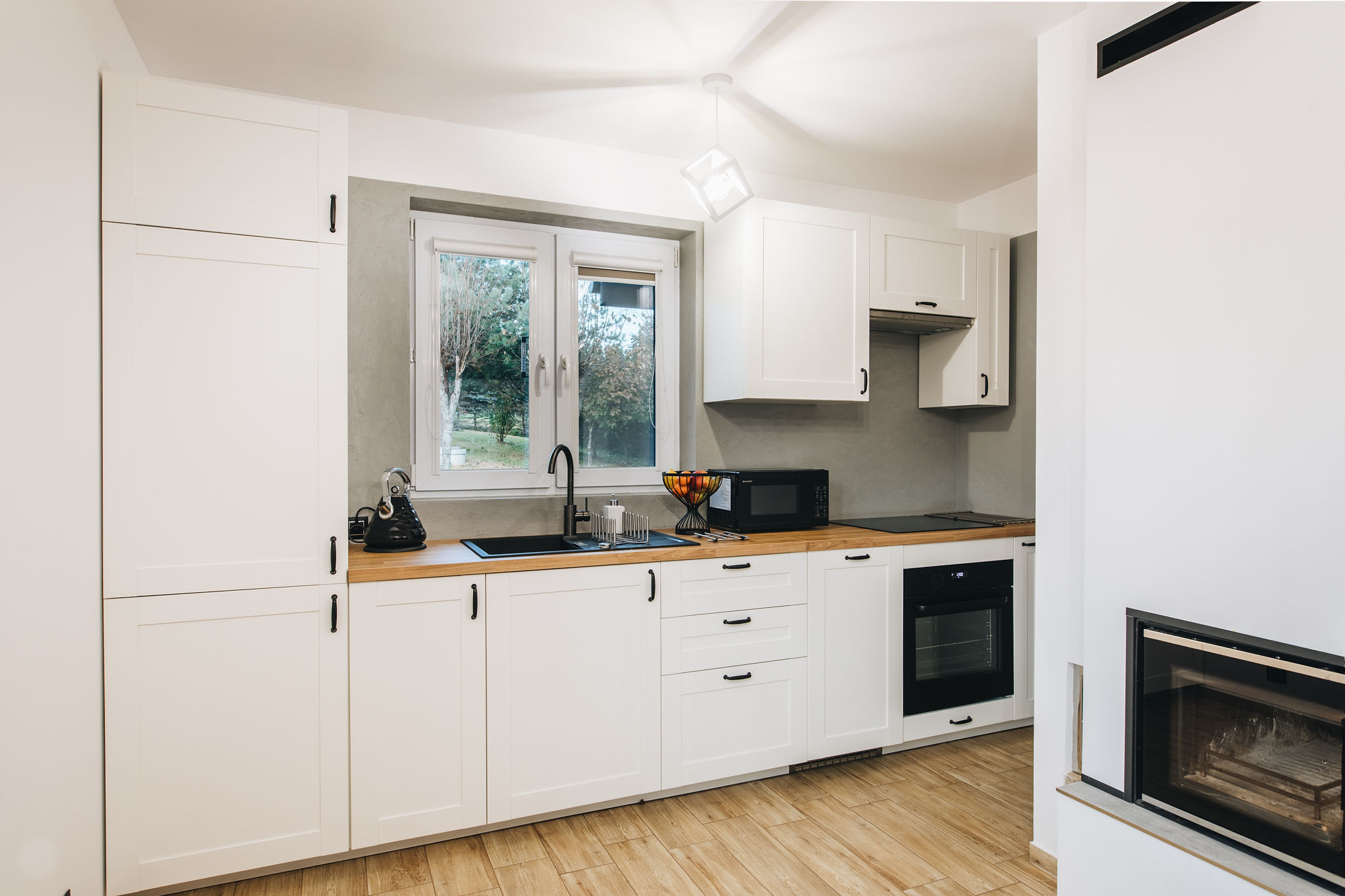 Na piętrze znajdują się 3 sypialnie oraz toaleta, natomiast na parterze zlokalizowana jest w pełni wyposażona kuchnia, łazienka z prysznicem, sypialnia oraz salon z kominkiem opalanym drewnem i wyjściem na duży taras.